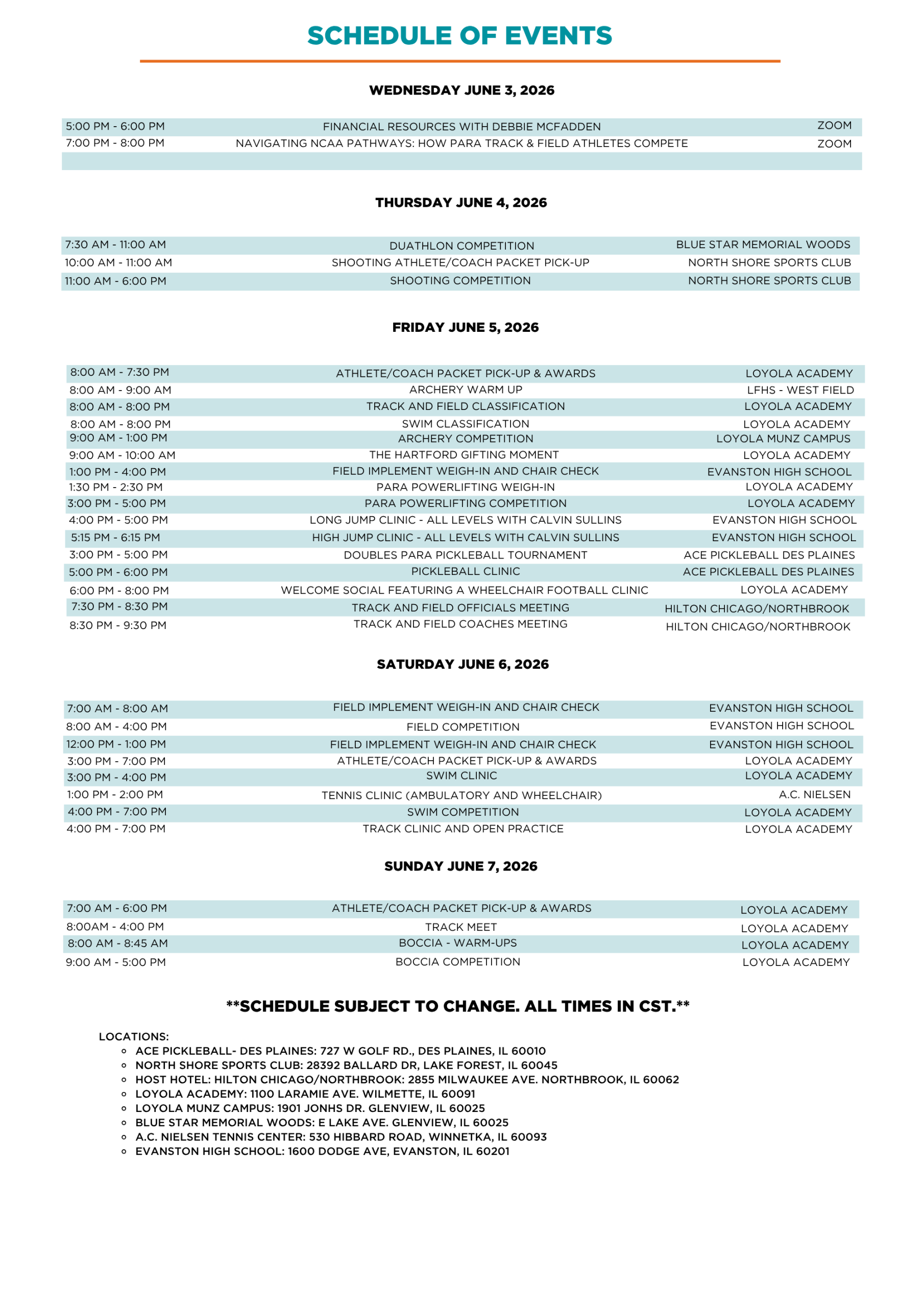 Live Competitions in Archery, Boccia, Duathlon, Para Pickleball, Para Powerlifting, Shooting, Swim, and Track & Field.